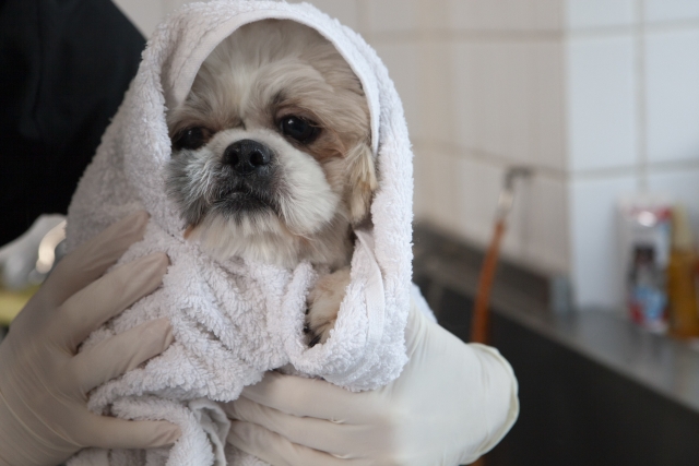 シャンプー後は、体が冷えないようすぐにタオルで水分を拭き取ります。