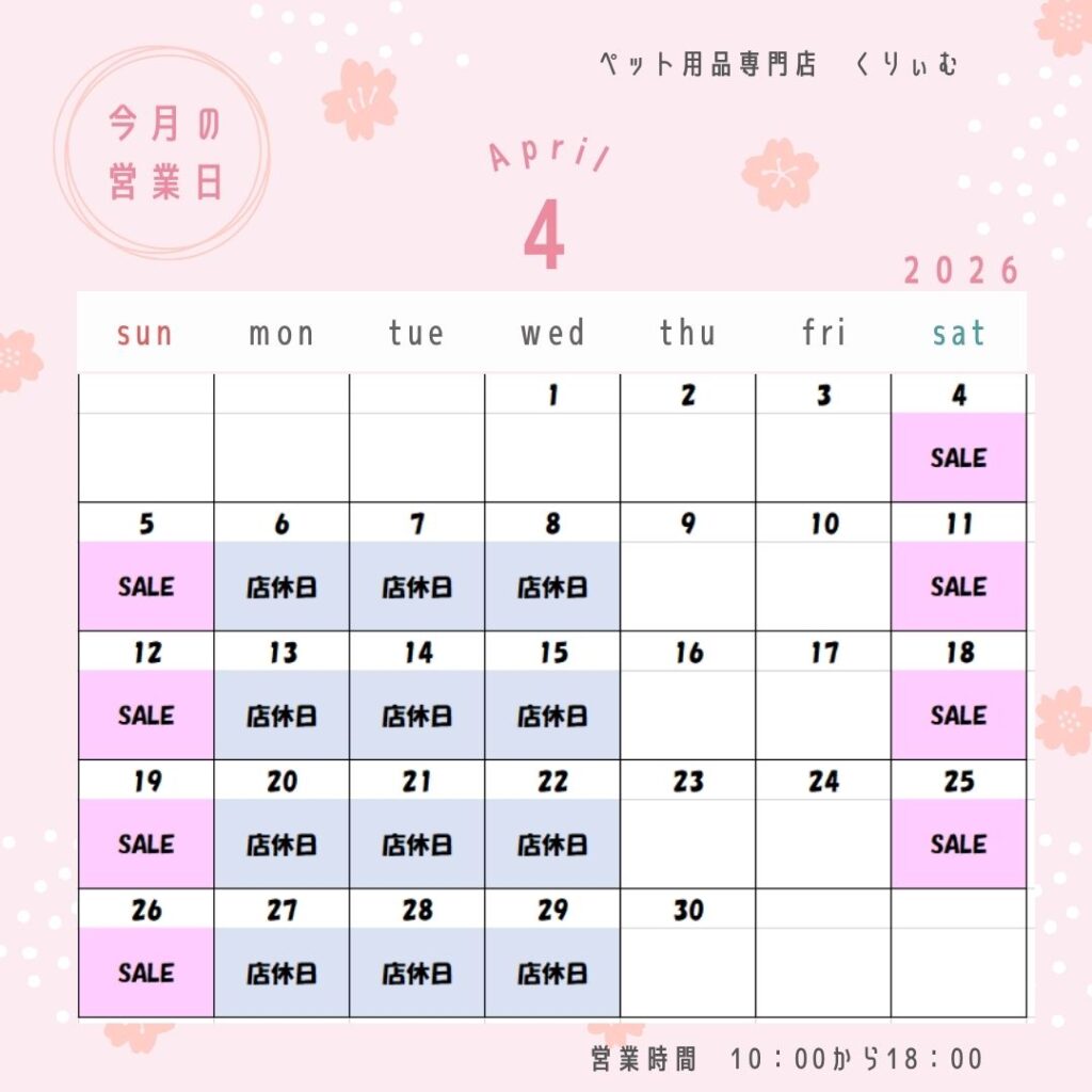4月の営業日・セールのお知らせ 2026年4月1日 全記事 お知らせ 目次 [ open close ] 2026年4月の営業日・SALE日・休業日について 2026年4月の営業日・SALE日・休業日について ペット用品専門店くりぃむです!今月のセール日をお知らせいたします。今月もお買い得商品をたくさん揃えて皆様のお越しをお待ちしています!詳しいセール内容はInstagramで最新の情報をご確認ください。 3月の営業日・セールのお知らせ HOME全記事